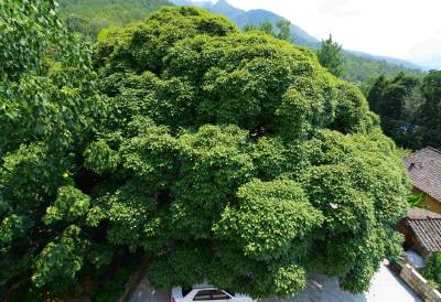7月25日,在保康县寺坪镇简家坪村何明亮的房子旁拍摄的千年“香樟王”。