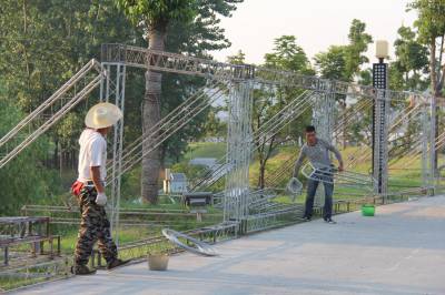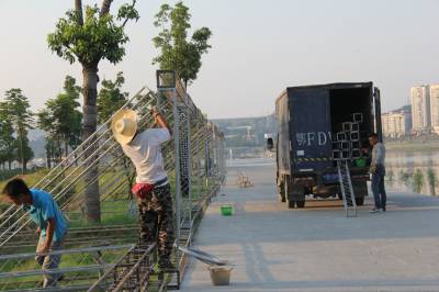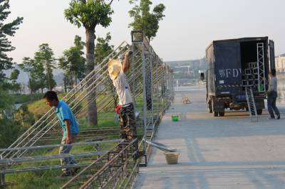 8月9日至11日,第四届中国摩托艇联赛“太平洋杯”冠军争夺战,将在南水北调中线调水源头、中国水都、亚洲天池——丹江口市,在风景如画的丹江口大坝下游城区汉江段沧浪洲生态湿地公园2号码头水域展开,来自国内的11支摩托艇梦之队将齐聚丹江口。本次大赛由国家体育总局水上运动管理中心主办,丹江口市人民政府承办,由中国太平洋建设集团冠名。目前大赛前期准备工作已就绪。图为7月26日,工人们正在烈日下安装广告牌。本报视界网钱芹 摄