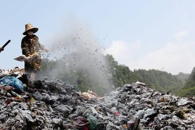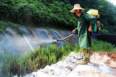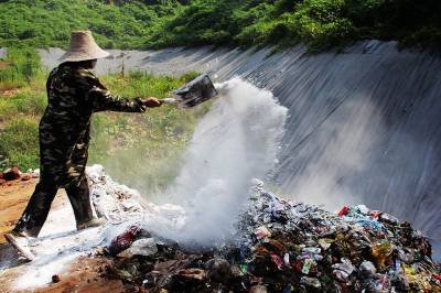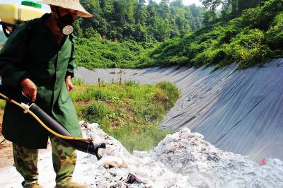 7月28日,宣恩县椒园镇红岩卡村垃圾处置场的2名消毒工人正在对当天进场生活垃圾进行撒石灰、喷农药等做消毒处理。