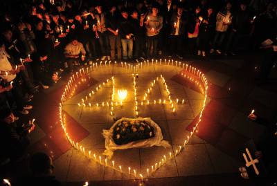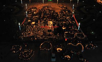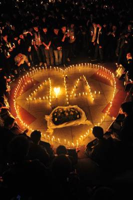4月21日晚,湖北省恩施职业技术学院万余名师生举行悼念玉树遇难者活动,用蜡光寄托哀思并纷纷向玉树灾区捐款。
