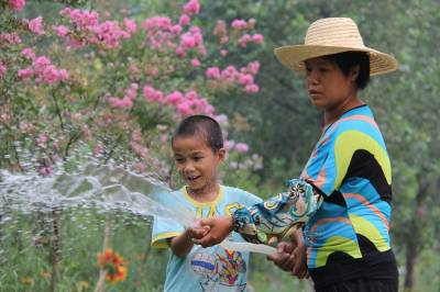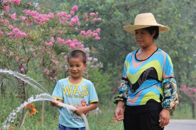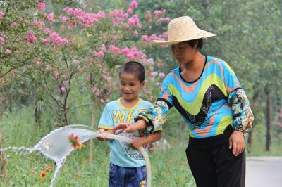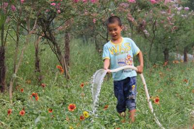 7月29日上午,丹江口市凉水河镇小学一年级学生马均宏,在妈妈劳动的丹江口大坝下游城区汉江段沧浪洲生态湿地公园里,按照妈妈的指导给花草树木浇水,忙得不亦乐乎。他放暑假就来到妈妈所在的工地,快一个月了。妈妈和几名民工负责给公园内新栽种的花草树木浇水,每天工作10个小时,可领到80块钱工资。爸爸在市区建筑工地打零工,每天可收一百多块钱。姐姐秋天要上高三了,整个暑期都在学校补课。“现在养一个娃子真不容易,什么东西都贵,代价大啊。”均宏妈妈感叹到。让夫妻二人欣慰的是,一双儿女都十分好学上进。本报视界网 钱芹 摄