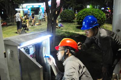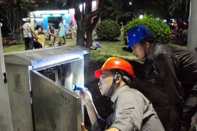 7月28日晚,老河口市供电公司的工作人员来到市区滨江广场,对广场舞临时用电线路进行检查,帮助跳舞的大妈们固定电源插座,包扎破损的导线,并指导她们如何正确使用漏电保护器,如何处理用电小故障。盛夏之际,每当夜幕降临,随着广场舞音乐的响起,老河口市供电公司组织的安全用电检查小组就会对周边的用电情况进行检查,为跳舞的群众提供必要的帮助。图为7月28日晚,该公司工作人员在滨江广场检查配电箱内的接线情况。(郭峰 13995745131)
