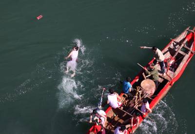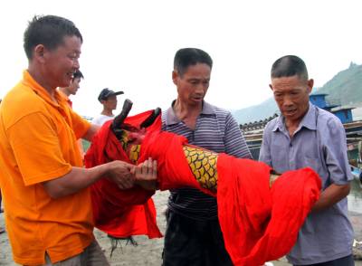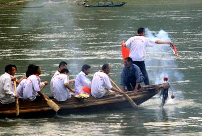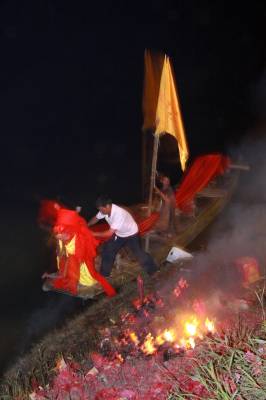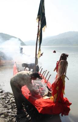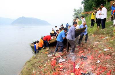 下午五点左右,没人放标了,龙船会也就结束了,收龙仪式是对着上山的龙王庙祭拜后把龙头放倒,在船上放鞭炮、烧纸钱,唱着龙歌把龙船划回村,全体会员抬龙船回到村里的龙船房,会首祭拜后安放好龙船。