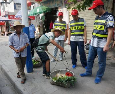 7月30日,来自各所高校的暑期放假的11名大学生在郧县城区各主要街道当起城管,来回巡逻劝离菜挑、果挑和西瓜车。来自湖北文理学院的王健,郧阳师专的王绪罡,十堰汽车管理学院的邓洁被分到东岭街的2中队,他们在师傅的带领下巡逻在东岭街上,一圈下来已是满头大汗,衣服也湿透了,反复劝离小贩时嗓子也冒了烟,3人感到城管工作太辛苦。