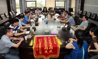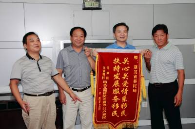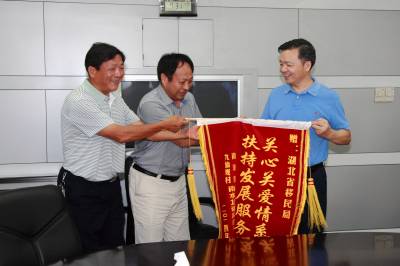 7月31日上午,湖北省移民局会议室,欢声笑语,瓜果飘香,原来是这里来了一批特殊客人——南漳县九仙观村移民代表将他们种植的葡萄与制作的“关心关爱情系移民,扶持发展服务移民” 的锦旗送到了省移民局。2010年,九仙观村接收来自郧县城关镇红桥村南水北调移民92户384人,当时,移民并不买账,认为区位优势不如老家城关镇,对未来发展致富很迷茫,拒绝搬迁入驻。为了尽快解决移民安稳发展问题,省移民局加大帮扶移民发展力度,用足用活惠农政策,全力支持各市、县开展移民技能培训,并给予资金扶持。南漳县政府组织移民分期分批到公安县、随县考察葡萄大棚种植,鼓励移民成立专业合作社,帮助移民建立了96个大棚葡萄示范园,在葡萄大棚套种蔬菜水果,现在每亩年收入已突破7000多元,初步实现南水北调外迁移民安稳发展。移民代表陈贵先用朴实的语音动情的说:“吃水不忘挖井人,幸福不忘共产党,今天,我们富裕了,我们就是要带着的劳动果实来与省移民局领导们分享……”,省移民局副局长陈万波从移民代表手中接过了锦旗。郑光松摄