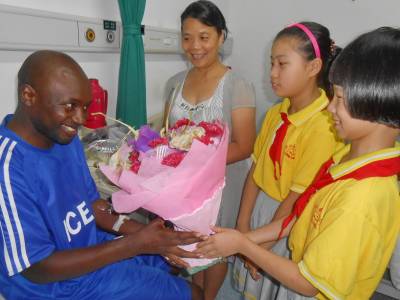 阿达姆(左)来自非洲尼日利亚,是华中师范大学国际学院的愽士生,深受武汉市江汉区春苗学校农民工子女学生欢迎的义务外教"洋雷锋"。2008年5月25日,他来汉留学。2010年5月,一次偶然的机会,他有幸与春苗学校的孩子们交上了孩子王,成为这群“流动花朵”的明星老师后。他每周星期一、星期五两次坐1个多小时的公交车,由洪山街道囗至汉口复兴村,准时到校上课。他在近3年时间里,他不收一分钱,不少一次课的进行义务教学,他还把参加电视台录制节目的辛劳费,都捐给了"流动花朵", 虽然他不知道雷锋,他用自己的行动,在"流动花朵"中奉献了雷锋精神。 阿达姆无私帮助“流动花朵”的事迹感动了荆楚大地和大学生们,在他的影响和带动下,有许多国外留生加入了自愿者行例中,阿达姆也因此获得了华中师范大学首届十大博雅学子,同时获得2011年湖北年度大学生十大人物。被誉为华中师范大学的“洋雷锋”等。