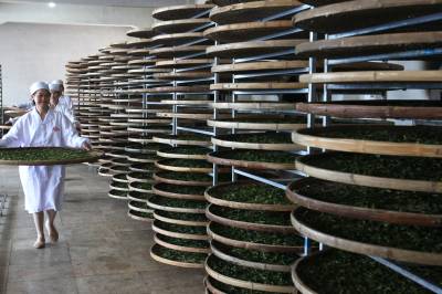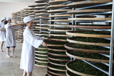 夏茶飘香 7月31日,竹溪县龙王垭茶业有限公司员工晾鲜茶叶。近年,竹溪坚持绿色发展,走“工农对接”之路,大力发展茶叶产业,拉长产业链条,开发出绿茶、乌龙茶、红茶、茶微粉、茶提取物等系列产口,现在茶园22万余亩,今年产值预计可达8亿元,带动10万人在茶叶产业链上增收。