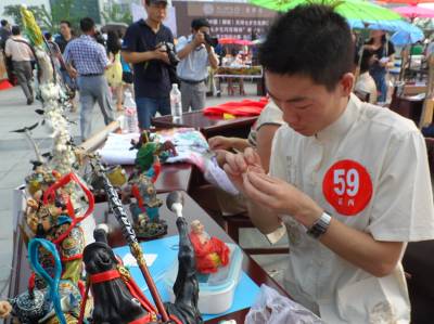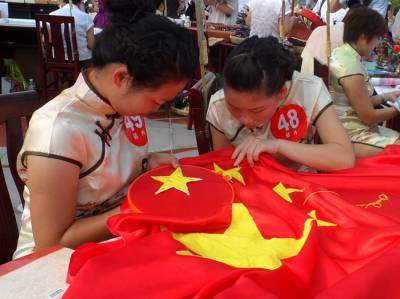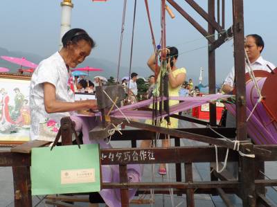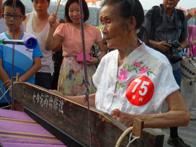 在比赛现场,身为男性的小伙赵刚,不拘世俗眼光,誓将姑娘们的传统绝活在男性中发扬光大;郧西特校的选手们积极向上,热爱祖国,用娴熟的技艺绣国旗;家住郧西县城关镇的93岁高龄的曹国彩老人更是精神焕发,不甘示弱,熟练地操纵着织布机,梭子在眼前来回穿梭,博得了阵阵掌声。