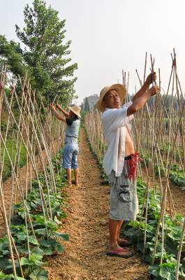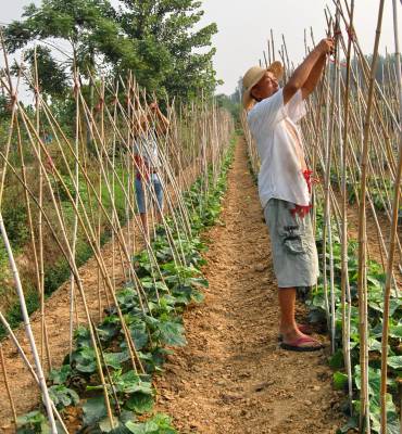 2014年8月1日,云梦县隔蒲谭镇陈刘村菜农在菜地为秋黄瓜扎架子。云梦县是湖北省蔬菜生产大县,眼下菜农在暑热天赶着清晨凉爽的天气为秋菜生产做准备,千方百计丰富城市居民菜篮子,丰富自己的钱袋子。本报视界网 陈保忠 摄