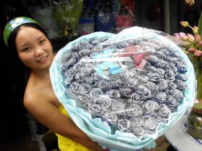 8月1日下午,在湖北省武汉市江汉区新华街自主创业就业的单洞花市上,何龙花艺店的彭霞,正在展示她的用彩纸扎成的99朵环保蓝色妖姬,由于是纸做的非常耗时耗工,所以价格在777元,迎接8月2日的中国情人节的消费者到来。 由于从上至下,都盛行节俭之风,所以花店的经营者,都看好了中国的情人节,希望能给他们带来好的经济效益。