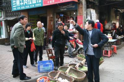 4月22日,在台北一路小南湖公园后门,一自称某街道管理人员的男子(右一)向几名菜贩收取管理费,一菜贩声称其收据无财政印章而拒绝交纳,该男子则威协道:”不交钱将以菜冲抵。”围观群众纷纷摇头:收钱岂不是让占道经营合法化了?!张垠摄江汉区园林局430022