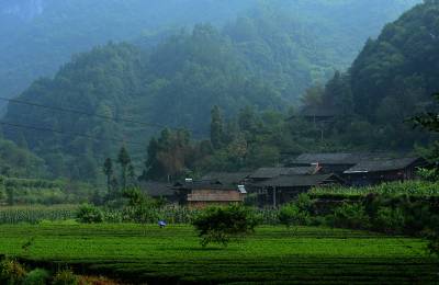 8月2日,一位村民正在湖北省恩施市盛家坝乡小溪原生态村落前采茶。