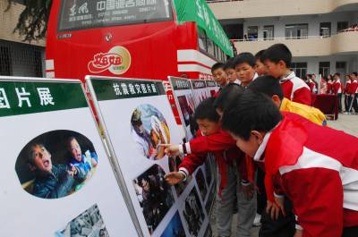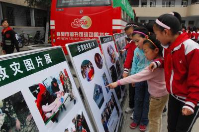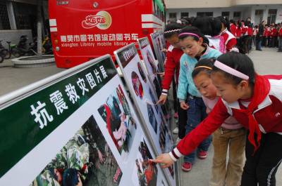 4月22日下午,襄樊市图书馆将精心挑选的100多幅青海玉树抗震救灾的图片,制作成展板,送进襄樊四中义务教育部,让同学们观看。该展览以”玉树,我们和你在一起”为主题,集中展现抗震救灾的场景。学生们看后,非常感动,纷纷拿出自己的零花钱进行捐助。