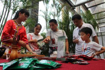 8月5日,几名来自河南郑州的游客正在购买富硒产品。 据了解,来自河南郑州旅游专列的400余名游客在恩施体验硒都养生之旅,游客们不仅可以感受土苗文化,欣赏自然美景,呼吸清新空气,还可以学习补硒健康知识,品寻珍硒佳肴优品。(本报视界网 温锋 钱国军 摄)