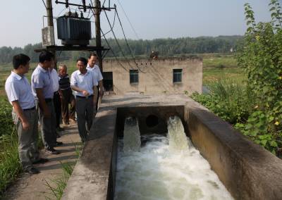 图1:在石花镇蔡营村泵站,县委书记艾文金(中)叮嘱镇村干部科学调水,让每户村民稻田都有水可灌。