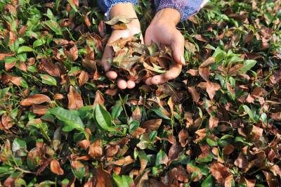 恩施茶园备受高温“煎熬” 8月5日,在湖北省恩施土家族苗族自治州恩施市芭蕉侗族乡高拱桥村,茶农在察看茶叶受灾程度。 连日来,湖北省恩施土家族苗族自治州持续高温,当地110余万亩茶园备受“煎熬”,因酷暑高温,部分地区出现茶叶被烤焦、茶树因缺水枯死现象。 视界网 谢顺 摄 13277590198