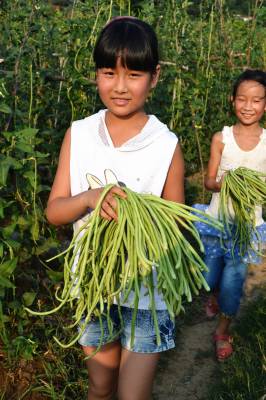 图2: 8月5日,郧县柳陂镇中心小学四年级学生小星语和同学小燕抱着采摘的豆角,开心极了。