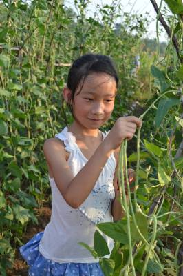 (通讯员 杨显有 王小虎) 图3: 8月5日,郧县柳陂镇中心小学四年级学生小星语正在田间采摘豆角,体验劳动的乐趣。