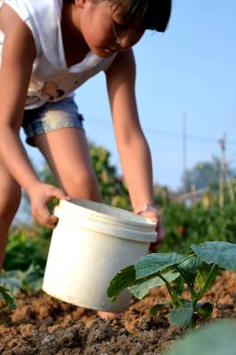 图4、5: 8月5日,郧县柳陂镇中心小学四年级学生小星语正在给瓜苗浇水。