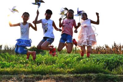 图6: 8月5日,郧县柳陂镇中心小学四年级学生小星语和同学手持风车在田埂上开心玩耍。
