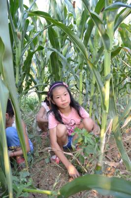 图7: 8月5日,郧县柳陂镇中心小学四年级学生小星语和同学正在玉米地里除草。