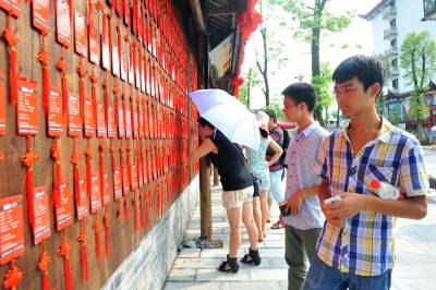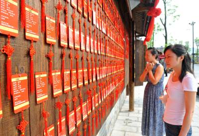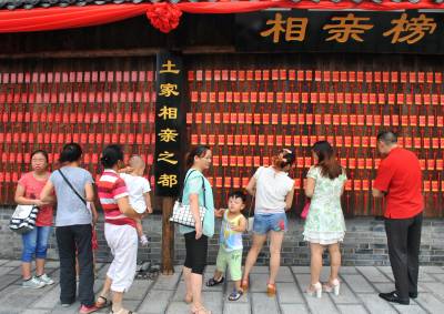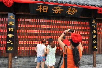 8月7日,青年男女在湖北恩施女儿城的相亲榜前察看相亲男女的个人信息。