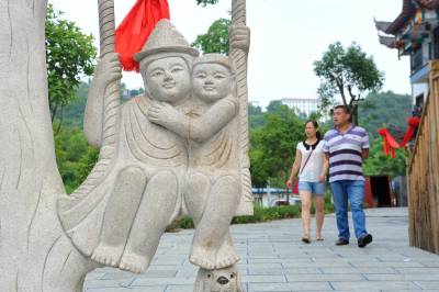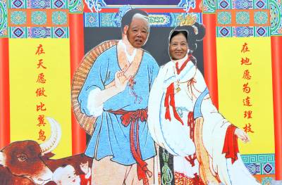 8月7日,一对在女儿会上认识的老年人在湖北恩施女儿城牛郎织女画前照相、许下浪漫心愿。