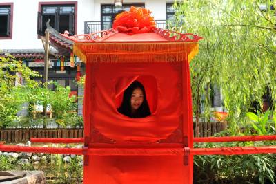8月7日,一位土家族女孩在湖北恩施女儿城的花轿上。