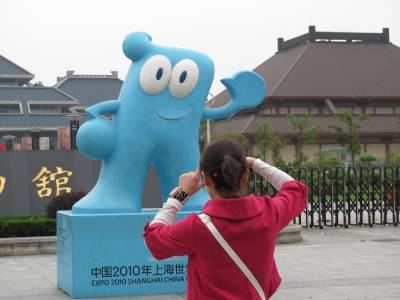 4月22日,一市民经过湖北省博物馆时正给海宝照像。为迎接世博会的到来,近日上海世博会吉祥物”海宝”雕塑,落户湖北省博物馆前,许多市民从此经过都要驻足观望、拍照留念。