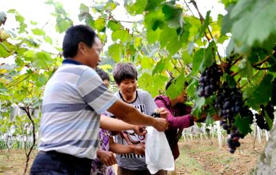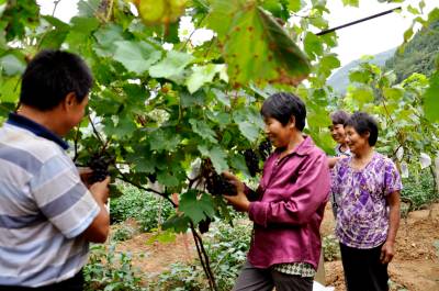8日,巴东县官渡口镇西溪坝村农民采摘葡萄。当天,西溪坝葡萄种植专业合作社负责人伍海贤接听订购葡萄电话一个接一个,来自湖北宜昌、恩施、巴东采购和品尝的客人一茬接一茬。据介绍,该村种植优质品种葡萄100亩,今年70亩葡萄进入丰产期,8月中旬大面积成熟。果农收入超过140万元。(本报视界网 穆世祝 摄)