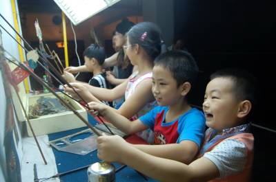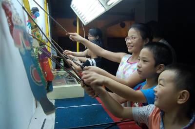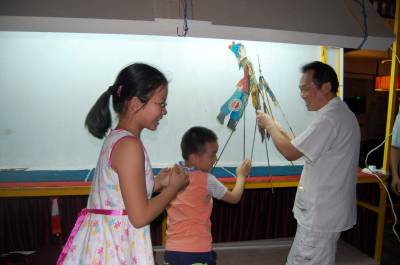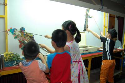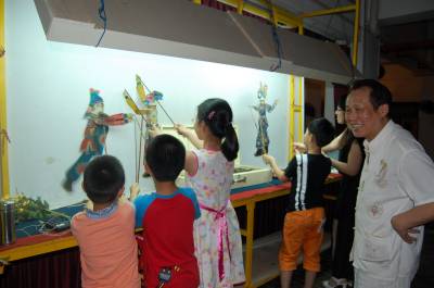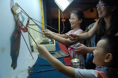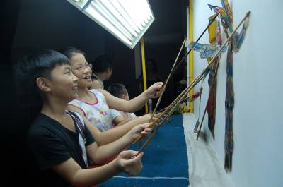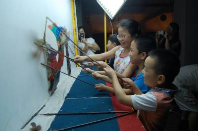 2014年8月9日晚,孩子们在云梦老茶馆开心看皮影,登台动手舞动皮影,一个个高兴得手舞足蹈。云梦老茶馆每周六晚都有免费的皮影戏演出。当晚,国家级非物质文化遗产项目代表性传承人、云梦梦泽演戏馆馆长秦礼刚在老茶馆表演了精彩的皮影戏《多足佛摆阵》。云梦皮影被列入国家级非物质文化遗产,孝感市杨先生等年轻的爸爸妈妈带着孩子们连夜专程从孝感来到云梦,让孩子们观看皮影表演,感受“非遗”,触摸“非遗”,零距离接触“非遗”。表演结束,孩子们一个个登上后台,高兴地拿起皮影在屏幕上开心地表演皮影,乐不思归,陶醉享受在“非遗”的乐趣中。本报视界网 陈保忠 摄