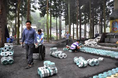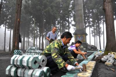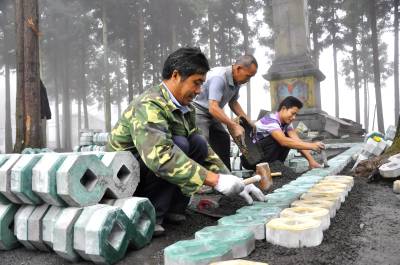 8月11日,在恩施市红土乡红军烈士纪念碑前,工人正在忙碌着抢砌草平砖。