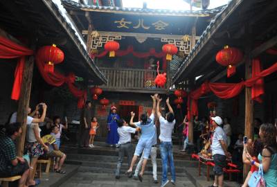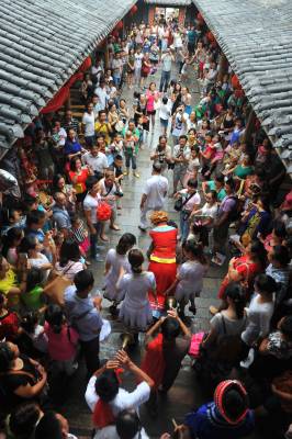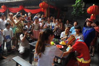 湖北恩施土家族传统婚俗包含抛绣球、订亲、插香、合八字、娶亲等步骤,其中,娶亲包括“哭嫁、陪十姊妹、发亲、拜堂”等多项仪式。多年来,充满神秘色彩的土家族传统婚俗只在民间少数民族聚居地举行,外来游客难以一睹土家婚俗“芳容”。土家传统婚俗“进城”,集中进行展示,使外来游客能零距离感受土家婚俗文化魅力,受到广大游客的喜欢。