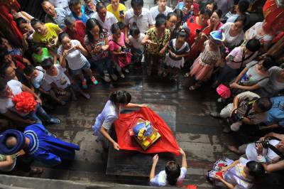 8月11日,土家小伙子在争抢土家幺妹抛下的绣球。