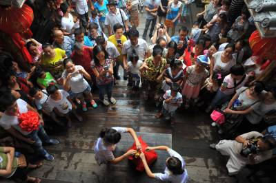 8月11日,在发亲仪式上,新娘被“高亲”背上花轿。(土家族所称的“高亲”为新娘的兄弟姐妹。)