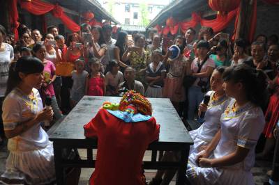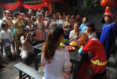 8月11日,在陪十姊妹仪式上,游客在听新娘唱哭嫁歌。