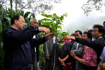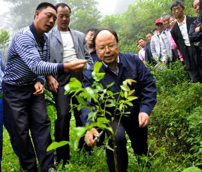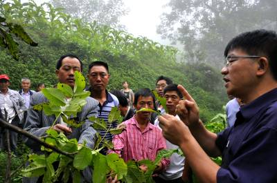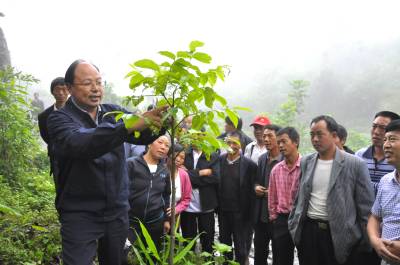 8月11日,在恩施市红土乡龙角坝村核桃树基地,森防专家正在讲解病虫害防治方法。