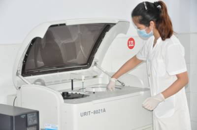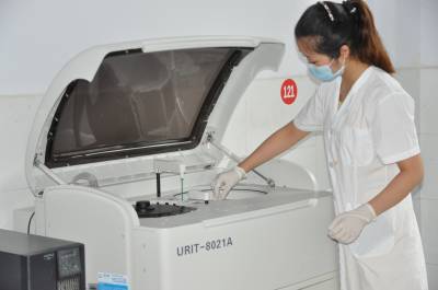 我省唯一的鹤峰县铁炉白族乡卫生院为打造先进乡镇卫生院,前不久投资50万元,购进CR和全自动生化分析仪,到目前CR检查病人1100多人次,全自动生化分析仪检查病人2300多人次。图为12日医生正在用全自动生化分析仪给病人分析病因。(本报视界网何吉安、田艳、彭景淼、)