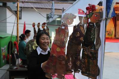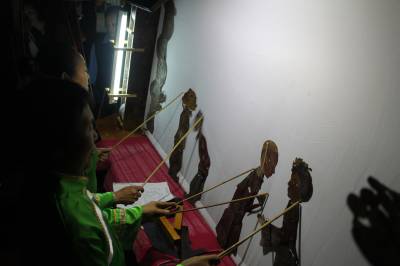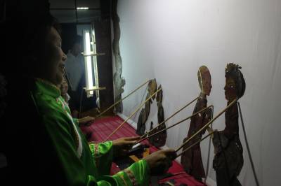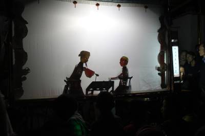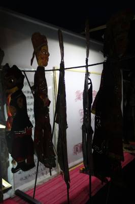 皮影戏,又称傀儡艺术,它是采用皮革为材料制成的,又以牛皮和驴皮为佳(图二)。它是用灯光照射兽皮或纸板做成的人物剪影来表演的民间戏剧。皮影人物被划分为生、旦、净、末、丑五个类别,表演队通过演出前几十分钟的准备(图三),待到傍晚时分,在白色幕布后面一边操纵戏曲人物,一边用当地流行的曲调唱述故事,同时配打乐器和弹奏弦乐(图四、图五)。