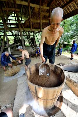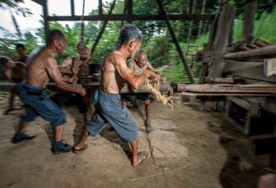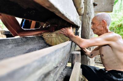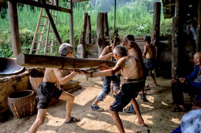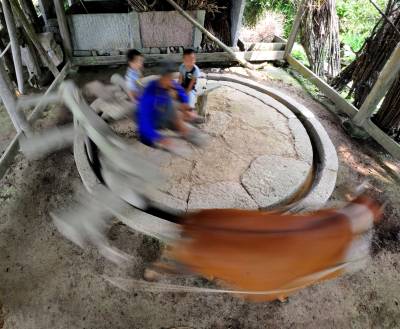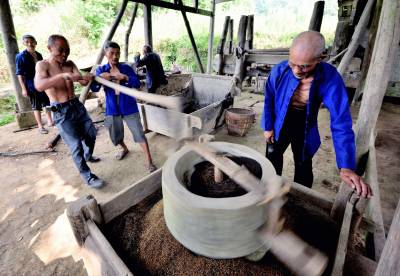 开榨时,掌槌的老大执着悬吊在空中的撞槌,唱着有节奏的号子,在助手的和应下,将长5米多的撞槌悠悠地撞到油槽中的“尖子”上,发出的撞击声有如长鸣的金钟,伴随阵阵油香从油坊里飘荡出来,遥遥不散。榨油坊里悠扬的号子声和着冲槌沉重的打击声、梁上吊绳的摩擦声、牛拉碾槽的节奏声,合成一曲别具韵味的古典民乐,久久回荡在大山里。
