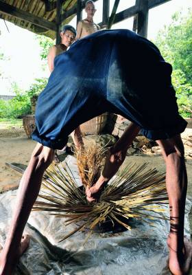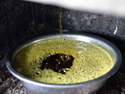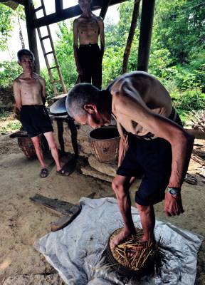据传,土家族人榨油要在榨油坊兴祭祖师。每年立秋或立冬是榨油坊开工日,榨油坊的榨工和在场的榨油客户要点亮蜡烛,燃起红香,虔诚地在神位前叩拜。土家族人把收获的菜籽、油茶籽、花生等油料作物晒干后,倒入土灶上的斜锅内翻炒,炒成茶黄色,舀出来倒在干净的地方摊凉,然后上磨粗碾:把菜籽倒入石磨,人力推磨,将菜籽碾碎,这是碾细的第一道工序。将碾碎的菜粉均匀地铺于碾盘的槽内,用耕牛带动碾架上的石磙碾压菜粉,再次加工。碾盘的直径一般有4米多,除碾槽和石磙外,所有的构件都由木材制成,做工精巧,转动时咿呀作响。下道工序就是上甑蒸熟,把碾槽里的菜粉装入一个大木甑子里,装之前在甑子内垫上稻草。灶膛的木柴熊熊燃烧,一直蒸得木甑内大冒热气,这时,榨油坊内雾气腾腾,芳香扑鼻。蒸到一定火候,就打坯分包。用稻草垫底,把蒸熟的菜粉填入圆形铁箍中,做成坯饼。打包成饼的工作要趁热做,将蒸熟的茶籽粉趁热分装在一格格的铁环里,做成饼。分装时先在地面铺一层塑胶纸,上放铁环,将干稻草扎成“把子”放在铁环内,稻草起隔离作用,不粘连,可以固定菜粉,使之成形为饼。在散开的稻草内倒入蒸熟的菜粉,用脚踩实,再将露出的草根沿边卷成索。