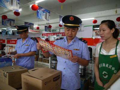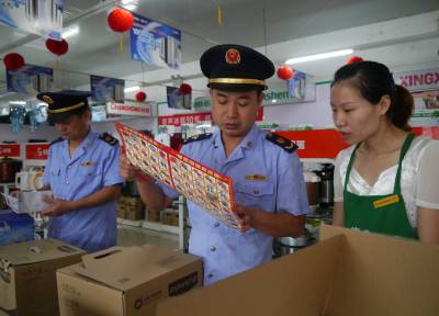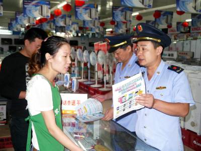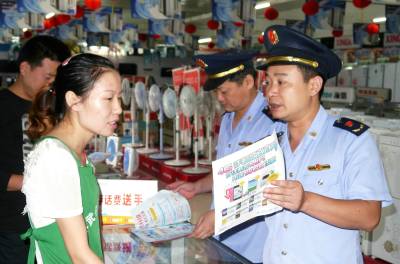 暑假期间,云梦县工商局开展了虚假违法广告专项整治行动。重点查处发布虚假打折、降价促销等信息误导消费者的违法违规行为。有效净化广告发布环境,维护消费者合法权益。图为,8月12日,该局执法人员在辖区一家电超市检查商品促销广告。(龚志荣/摄)