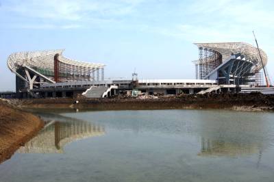 4月23日,荆门生态运动公园体育场在蓝天白云映衬下更显英姿。该生态运动公园是省十三动会主会场,而体育场是生态运动公园主体工程,备受各方关注。目前,体育场各项工作进展顺利,包括钢结构和混凝土的主体工程已完工,正进行墙体装修和地面施工,本月底,将进行场顶钢罩棚的安装。视界网摄影师朱运兵摄