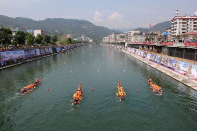 第二届水上运动会开幕。图为龙舟竞赛场景。 为庆祝恩施土家族苗族自治州建州31周年,加强各县市间民族文化体育交流,由宣恩县人民政府、恩施州文化体育局主办,宣恩县文化体育局承办的恩施土家族苗族自治州第二届水上运动会在宣恩县城区的贡水河畔举行。 本次运动会设有龙舟竞赛、水上排球、游泳等项目。来自恩施、利川、来凤、建始、咸丰、鹤峰、宣恩的8个县市,共45支队伍近1000名群众运动员将参加为期三天的水上运动比赛。 (本报视界网张子家摄)