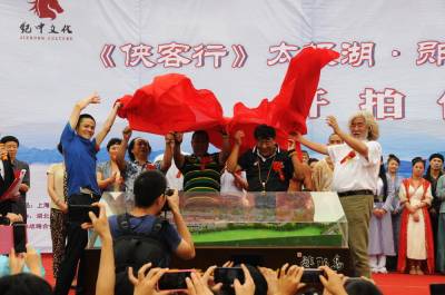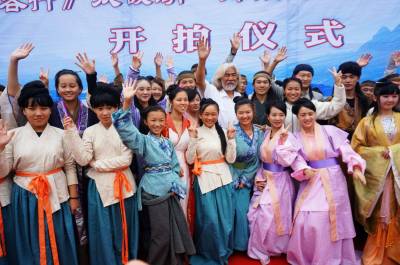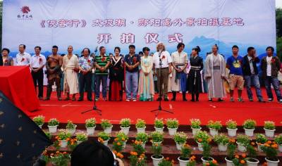 8日16日,著名导演张纪忠武打电视连续剧<<侠客行>>太极湖.郧阳岛外景拍摄基地开拍仪式,在郧县郧阳文化广场举行,现场举行了拍摄基地揭牌仪式和拍摄揭幕仪式,各路演员合影后奔赴郧阳岛进行外景拍摄。 视界网 周家山 摄