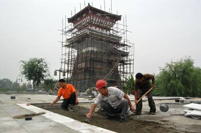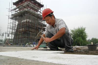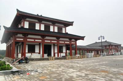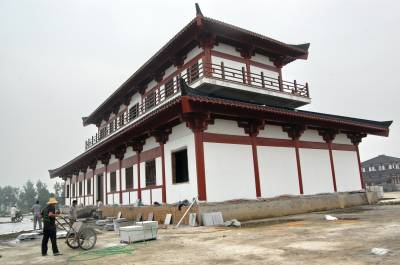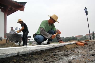 2014年8月16日,工人们在云梦黄香文化园施工。 黄香,古孝子,江夏安陆(今湖北云梦)人, “二十四孝”中“扇枕温衾”故事的主角,被誉为“天下无双,江夏黄童。”黄香是一位孝子,也是一个廉洁爱民的清官。近年来云梦县充分发掘悠久历史文化资源,大力弘扬孝廉文化,在黄香出生地云梦义堂镇黄孝村高标准规划建设中华黄香文化园,打造孝廉文化教育基地。该基地主体工程已经完成,2014金秋十月第四届黄香文化节将开馆投入使用。本报视界网 陈保忠 摄
