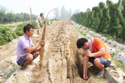 一根山药连起湖北山东两省农民 8月15日,来自山东荷泽的几位农民正在帮助谷城县冷集镇农民收获山药。谷城县冷集镇农民种植有2万亩山药。因山药收获时需大批劳力,因此,每当山药收获时,便请来荷泽、东单等地的农民帮助收获山药,管吃管住工钱日清月结。而荷泽、东单等地的农民,善于培育山药种,每到种植山药前,谷城县冷集镇农民又会前往荷泽、东单购买山药种,促进了山药增产增收。 视界网马明刚摄