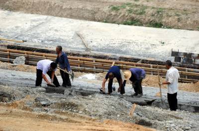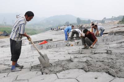 8日18日,施工人员正在郧县辽瓦新集镇西侧加紧施工汉江堤岸防护挡墙护坡。辽瓦新集镇是南水北调中线工程水位线下搬迁的复建工程,为赶在畜水前完成丹江囗库区地质灾害库岸治理应急工程,辽瓦新集镇滑波治理需开挖土方61607立方米,回填土方74478平方米,填土碾压73485立方米,各类砼8858立方米,反滤层1276立方米,砼管安装465米,浆砌1516立方米。 视界网周家山 赵弘然摄