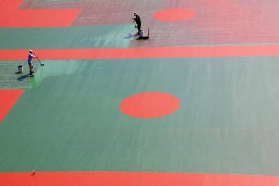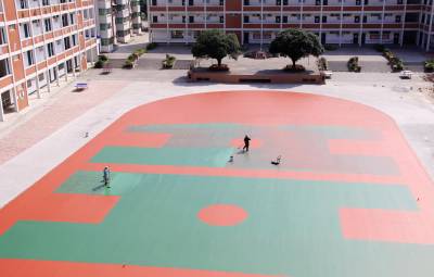8月19日,烈日下的工人们在竹山县宝丰镇施洋小学塑胶运动场上紧张施工。近年来,该县加强农村学校标准化建设,推进农村学校规范化办学,加快农村薄弱学校改造步伐,提高农村学校教育装备水平。在缩小城乡学校差距上下工夫,把农村学校纳入义务教育均衡发展快车道,让农村让学生人人都能享受优质教育。