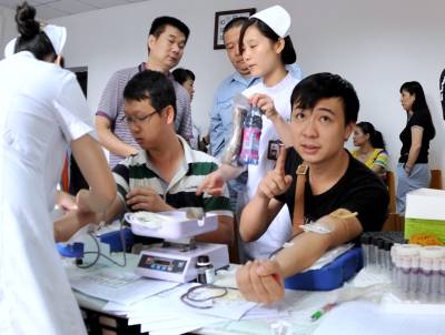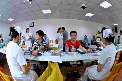 2014年 8月20日上午,武汉分公司90名员工来到献血点,进行一年一度义务献血,有一个年轻的员工在记者的镜头前说:我是中石化一名年轻员工,我第一次献血感到光荣,为需要用血的人献一点血感到高兴。 摄影 岳力克